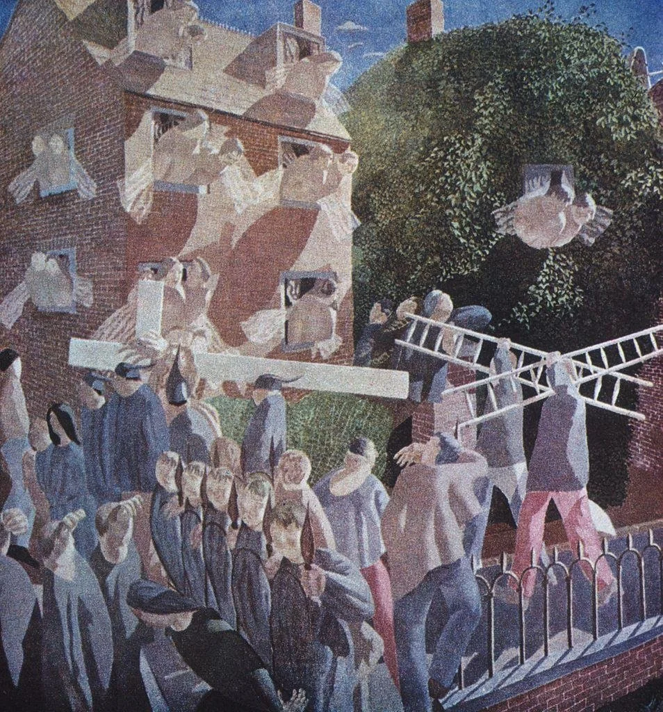 I include here two of my favorite pictures. The first, Christ Carrying the Cross (1920), shows the road to Calvary as passing by a friend’s house in Cookham. Christ is barely visible behind the various onlookers. Notice how the crossed pair of ladders echo the cross itself in a kind of sacred rhythm, showing forth the sanctification of the ordinary. Spencer’s desire to show the road to Calvary as something so integrated into village life did not arise from a lack of seriousness. Rather, as he put it, “Christ had made everything wonderful and glorious,” and he believed that he might “be able to join in that glory.”[2] Indeed, there is something both beautiful and intensely painful to me that the suffering of the cross should be made so ordinary. Our attentiveness to actually seeing Christ in this picture—looking as though he were another resident of Cookham—seems to visualize the visceral reality of everydayness that comes with the fulness of Incarnation.